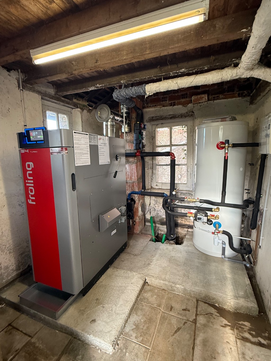 Remplacement d'une ancienne pompe à chaleur en relève avec chaudière fioul par cette magnifique Froling bois bûche S4 TURBO.