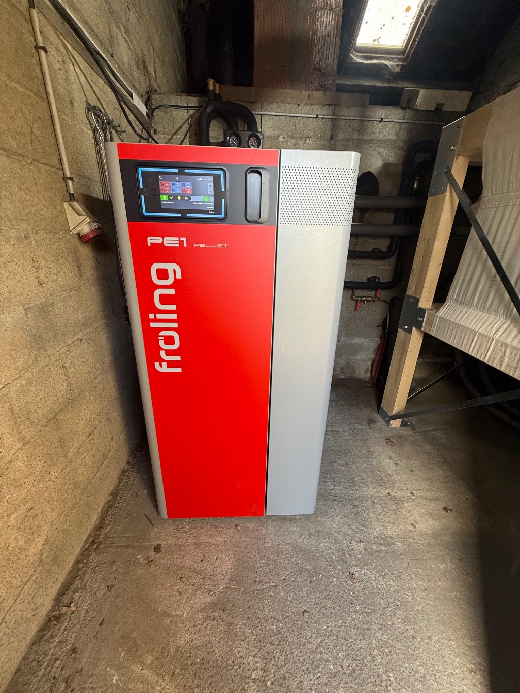 Remplacement d'une ancienne chaudière fioul énergivore par cette chaudière à granulés Froling PE1 haut de gamme.