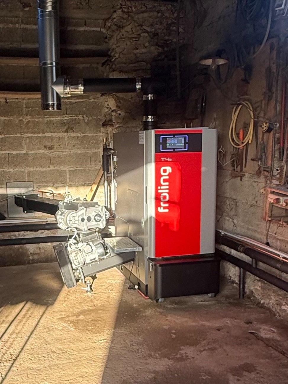 Montage d'une chaufferie bois déchiqueté froling T4e en remplacement d'une trés veille chaudière fioul énergivore .