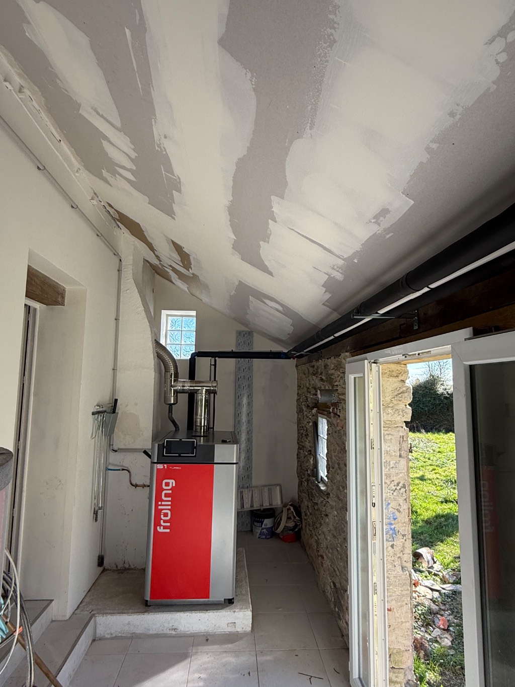 Montage d'une chaufferie bois bûche Froling S1 Turbo, cette Froling est raccordée sur ballon tampon et préparateur d'eau chaude sanitaire.